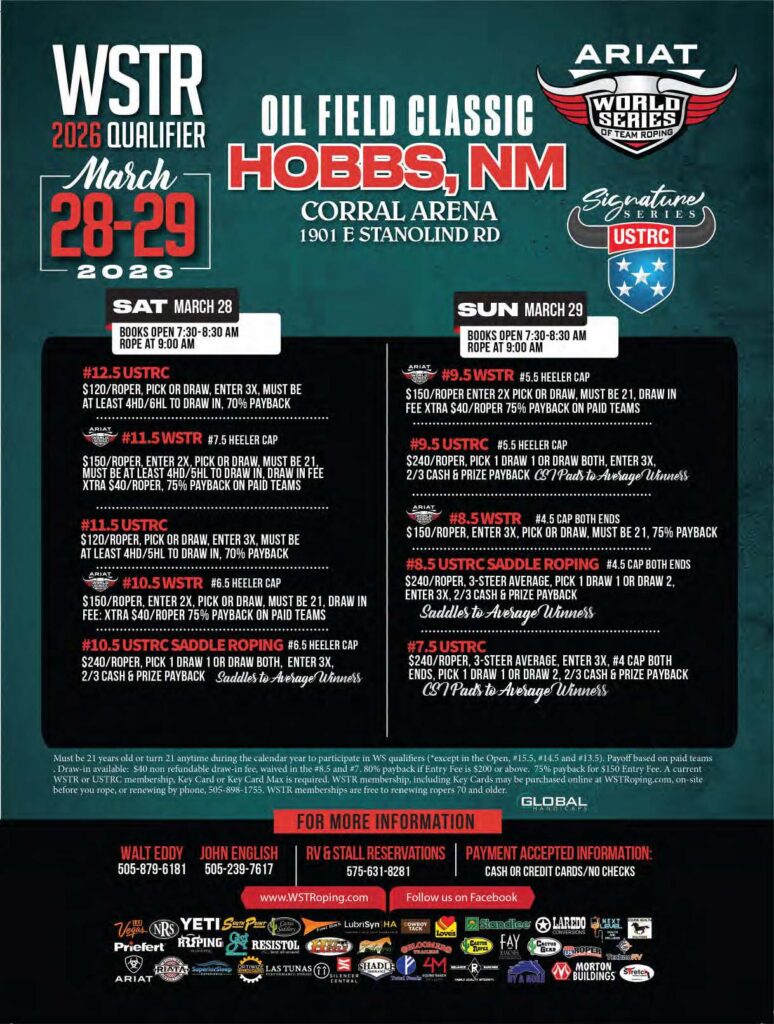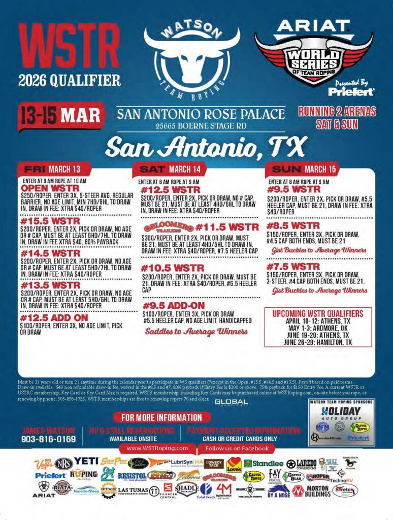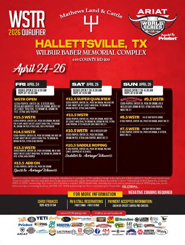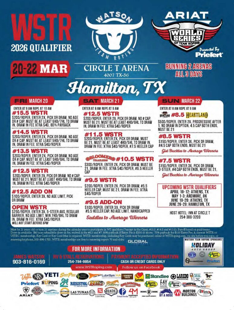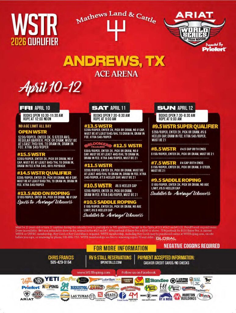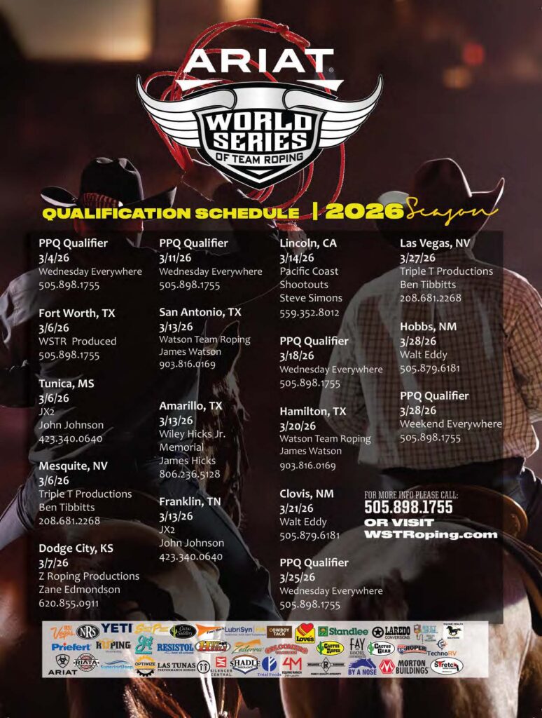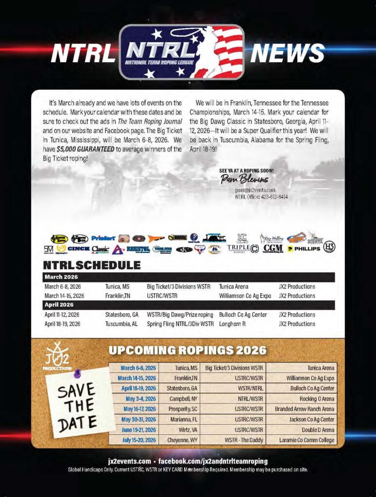 Never miss a roping! Check out the team roping event ads for March 2026 and beyond.
