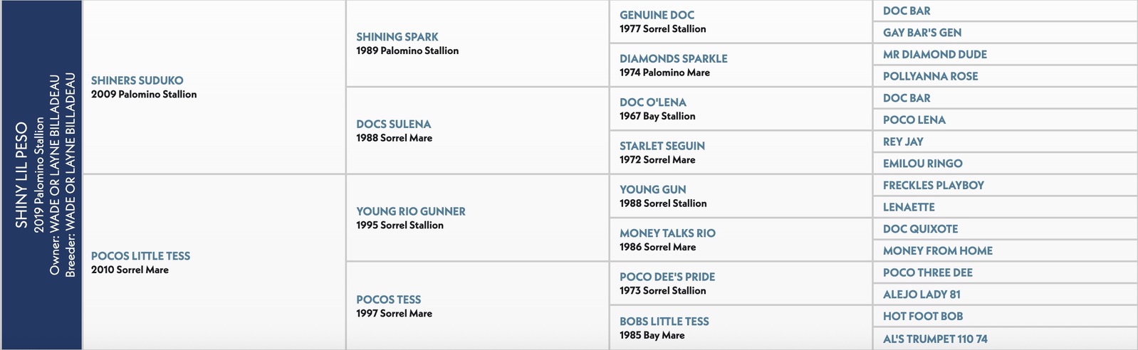 Peso is the 2019 palomino gelding by Shiners Suduko that English has ridden for most of his appearances at the 2025 Riata Championships, including a sixth-place finish in the Riata #14.5 Championship with Miles Baker for $34,800, and a check for fast time that didn’t place in the short round in the #12.5 Championship with Shawn Vargas.