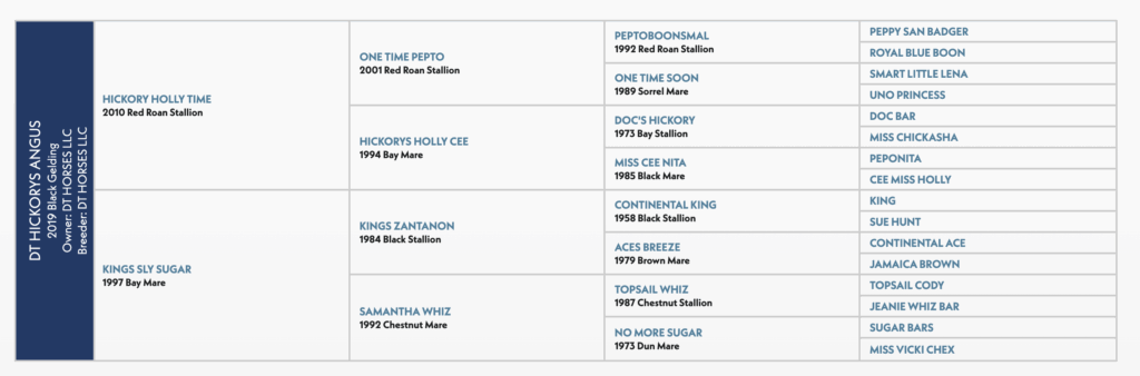 DT Hickorys Angus is great by design. He’s out of one of DT Horses’ flagship broodmares, the Kings Zantanon daughter Kings Sly Sugar, the dam to Brady Minor’s former Horse of the Year Rey Shines On Top. And by $4.5 million Hickory Holly Time, who carried Kelby Phillips to the World’s Greatest Horseman title in 2018, DT Hickorys Angus was destined to be great.