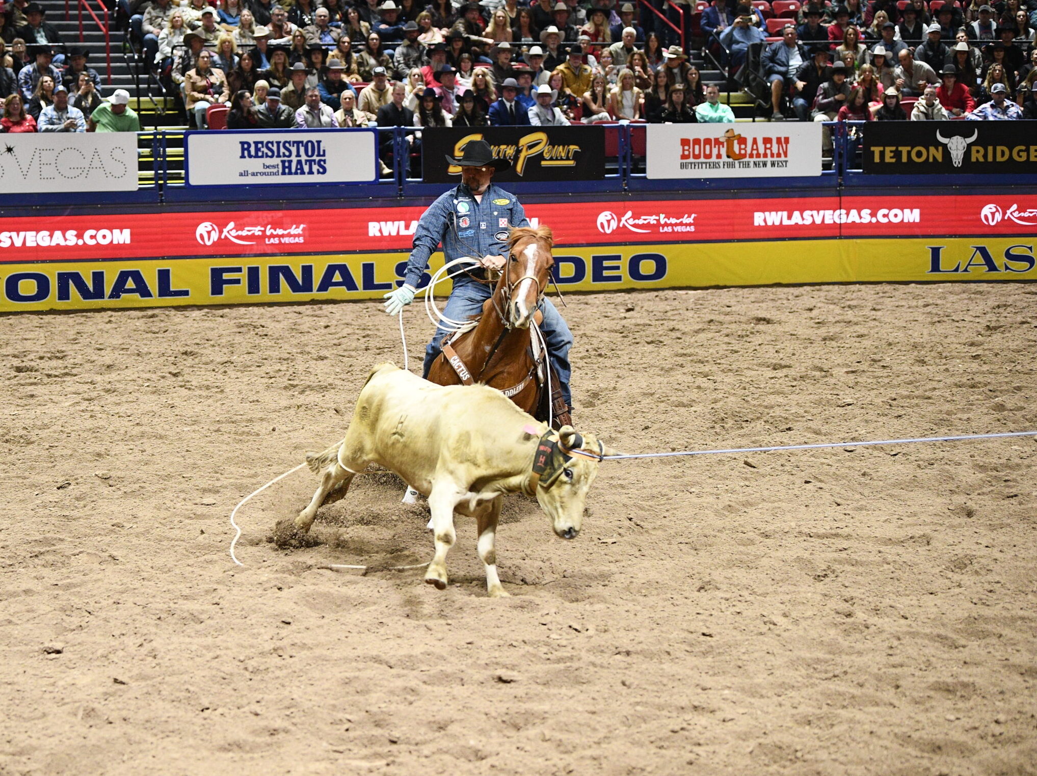 Champ’s take: Dustin just did his signature deal: had him wearing it right there. Levi got a little to the inside and a little tight, and that steer was kind of out to the right of him and he just kind of spiked the leg. But they got him down. It’s a rare leg shot for Levi.