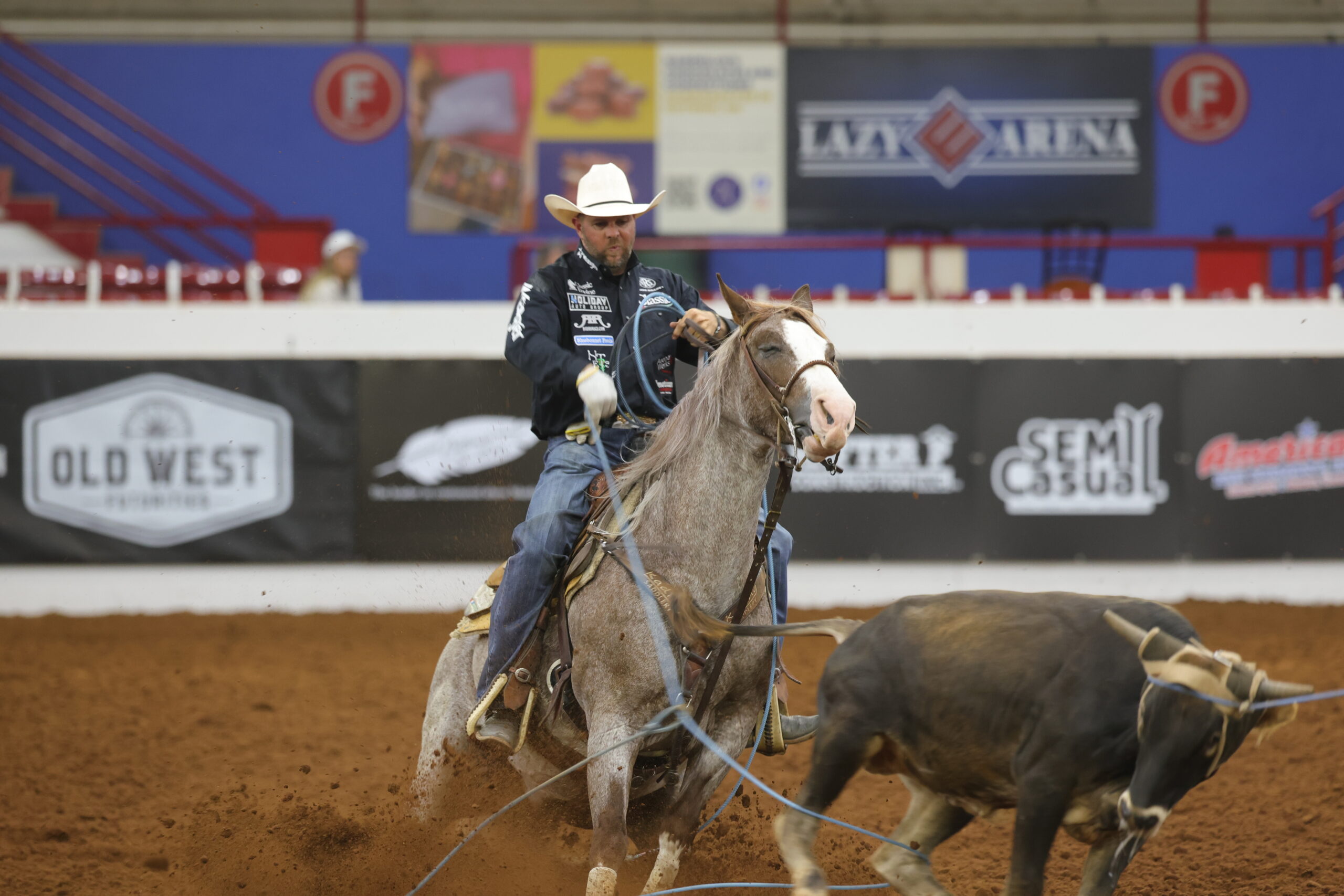 Joseph Harrison and Hes Got Sann hold the lead in the 6-&-Under Futurity Heeling after three rounds at the Old West Futurity’s Gamble at Guthrie, sitting on a 685.22 heading into the short round.