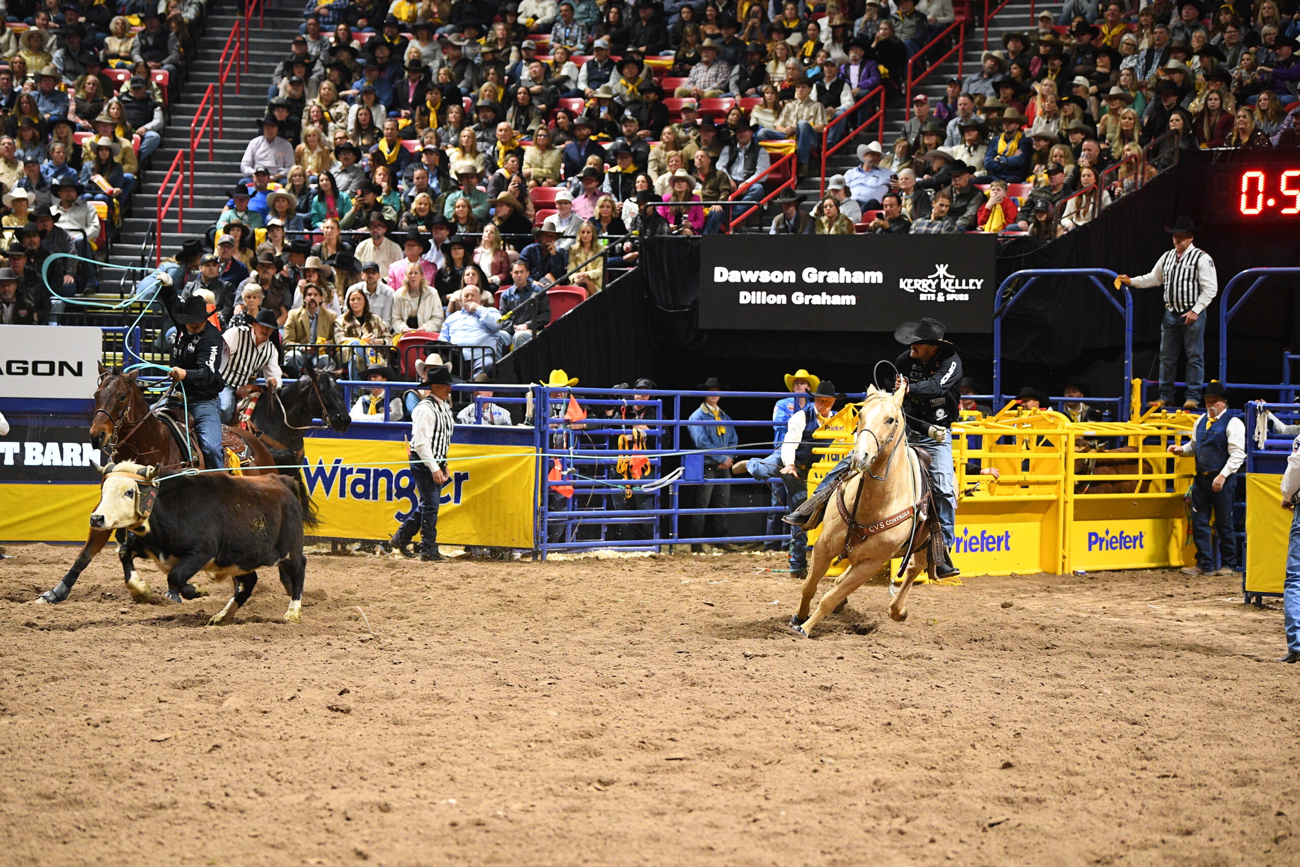 It might be the first time in the little yellow arena in Las Vegas for the Grahams, but it’s not their first time in a setup like this. The Canadian rodeo arenas’ are often set on hockey rinks, so the wall coming fast is familiar to the brothers. Plus, they had a little help from some friends who are relatively familiar with success in Las Vegas.