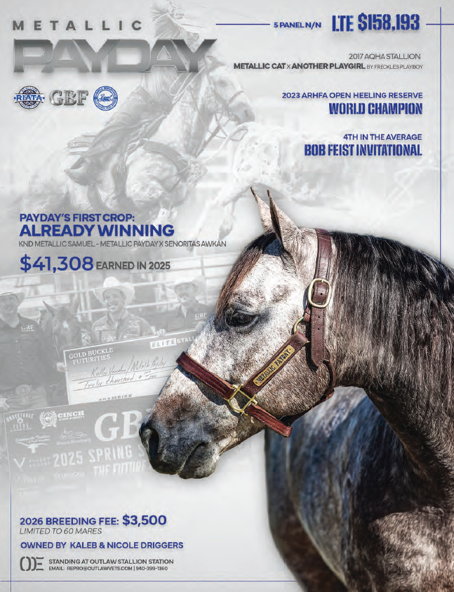 With Metallic Payday’s first crop just coming of age, his influence is already impressive. His first foal to compete, KND Metallic Samuel, has amassed better than $40,000 after winning two of five futurities entered in 2025.