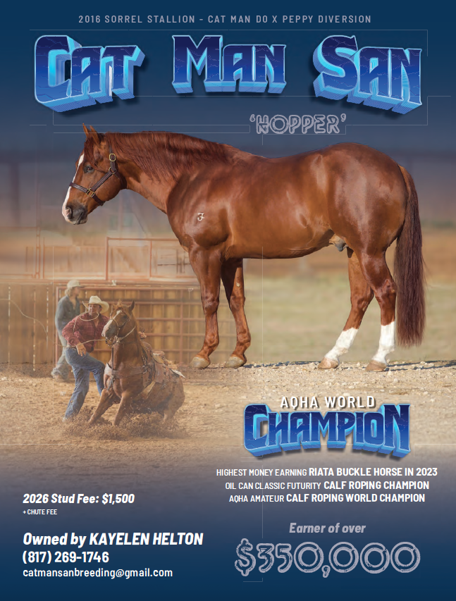 By the High Brow Cat/Freckles Playboy stallion Cat Man Do and out of the race-and-cow-bred Waggoner mare Peppy Diversion, Cat Man San was a tie-down roping futurity and AQHA champion the same year he earned $129,153 heeling and $105,555 heading, according to QData.