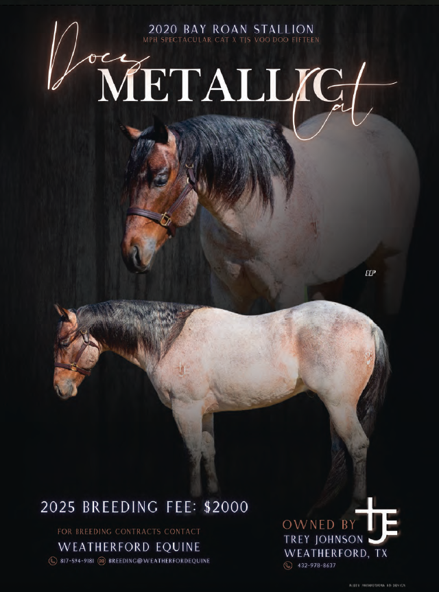 Like many other elite ropers, Trey Johnson banked on mare power when looking for a good prospect, crossing his rodeo mare, TJS Voo Doo Fifteen, on the superbly bred MPH Spectacular Cat to produce his own stallion prospect, Docs Metallic Cat.