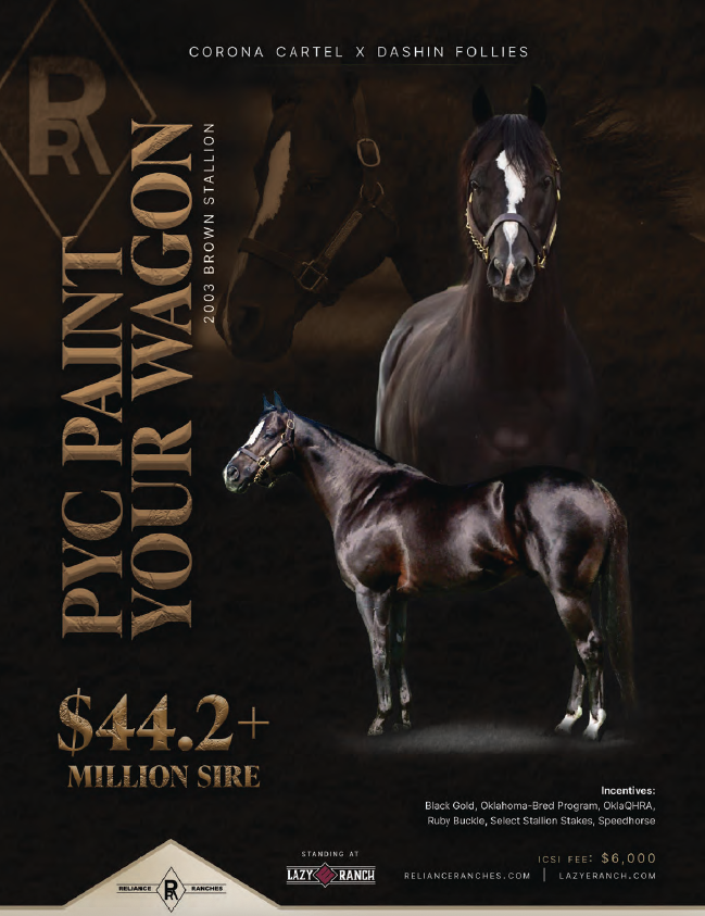 Proving it’s not how you start, it’s how you finish, PYC Paint Your Wagon was born small and re-purchased in the 2004 Ruidoso Select Sale but went on to be a top-10 all-time race sire whose progeny are winning in the arena and on the track.