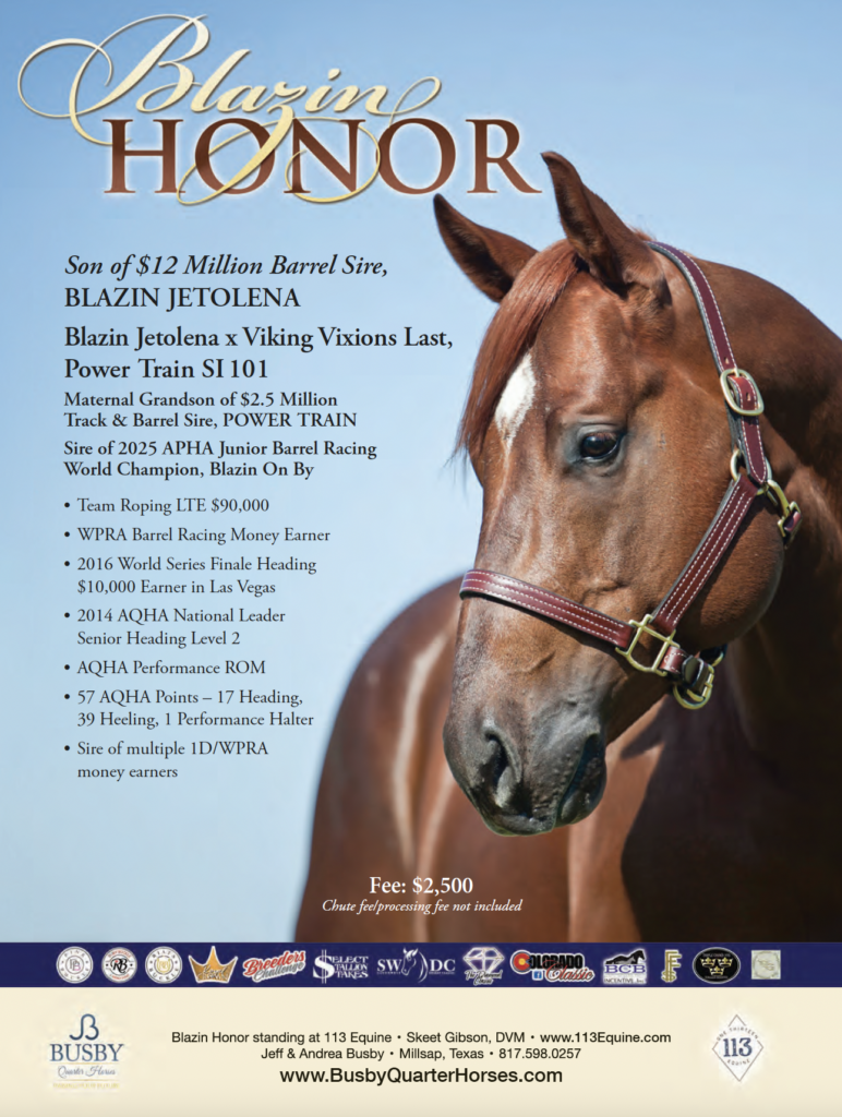 Among his winning progeny are multiple winners in the team roping including Blazin Merada, the 2024 Reserve Champion at the Riata #10.5 Youth with Hoyt Darnall. On the barrel pattern, Blazin Honor’s offspring Blazin On By is the 2025 APHA Junior Barrel Racing World Champion.