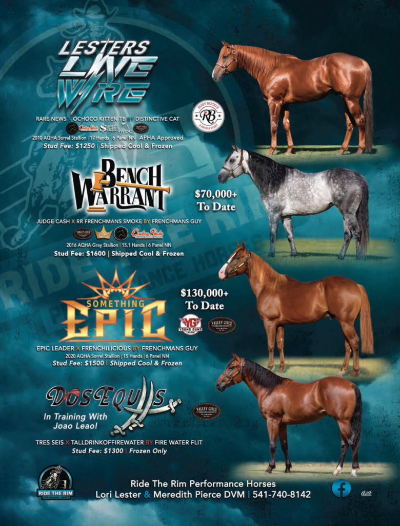 A venture born from the partnership and enthusiasm of two horse lovers, Ride the Rim Performance Horses’ lineup of top stallions features some of the industry’s best bloodlines, all managed by equine reproduction veterinarian Meredith Pierce, DVM, and Lori Lester.