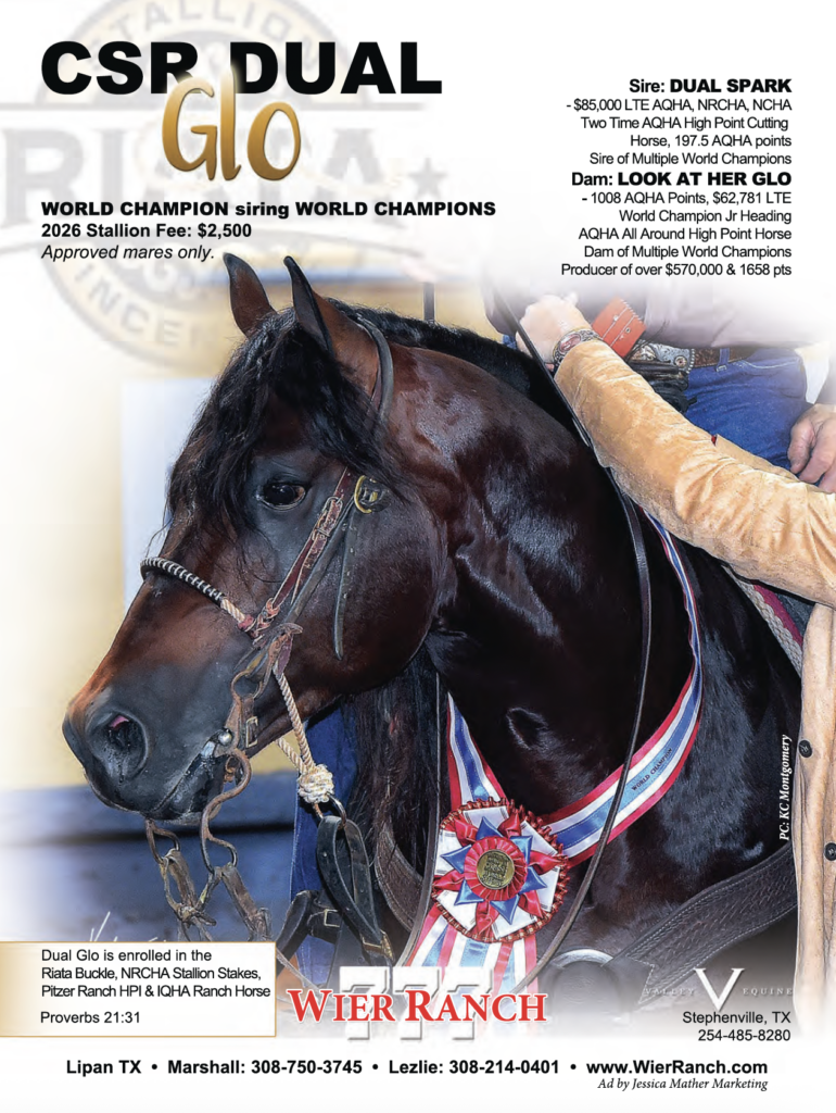 Probably the greatest contribution of the Pitzer Ranch-bred stallion is through his daughters, which are being bred to Dual Glo with great results. In their pursuit of raising great champions, the Wier family always credits the people in their circle.