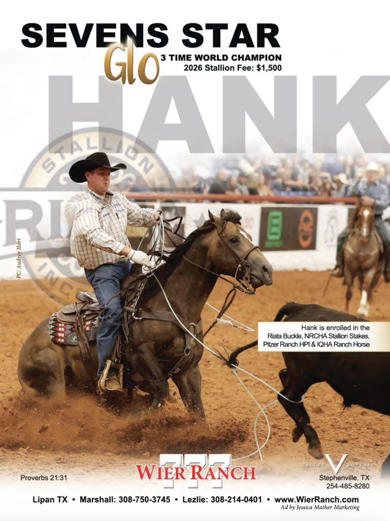 The triple “Sevens” brand on a horse’s left hip has become synonymous with high-caliber rope horses, and the Wier Ranch has a great mare lineup and family of proven stallions in CSR Dual Glo, his son Sevens Star Glo, Sevens Spanish Gold and outcross stallion Two Eyed Brazos.