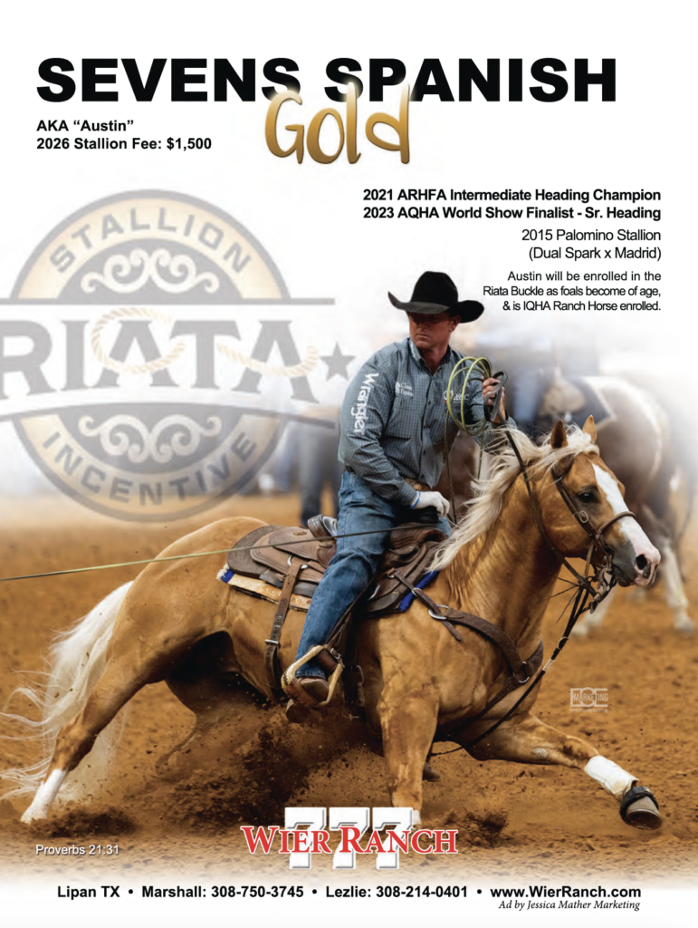 Also last season, Tate Kirchenschlager won the ARHFA’s Sun Circuit Pre-Futurity Heading aboard 4-year-old Sevens Aspen Glo, by Dual Glo out of the 777 mare Madrid. She is also the dam of Wier Ranch’s palomino stallion Sevens Spanish Gold (“Austin”), by Dual Spark. Madrid is a proven producer out of the legendary AQHA world-champion team roping mare Jack E Eleven, by Gallo Del Cielo.