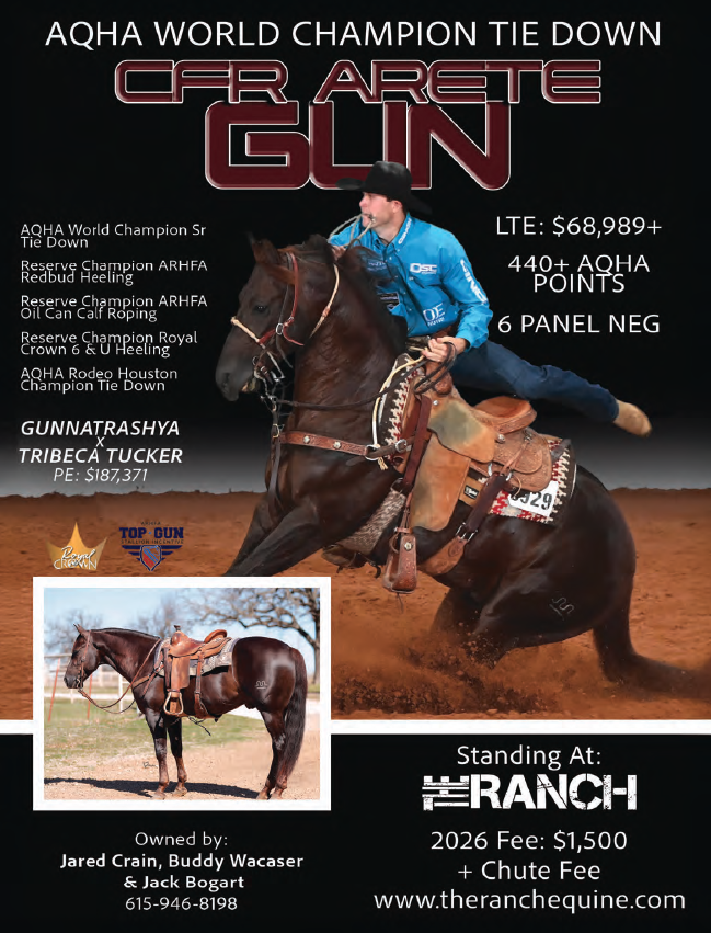 By the $9 million sire Gonnatrashya and out of a daughter of Tribeca Tucker, Arete has been successful in tie down and heeling at the AQHA World Show with Cody McCartney, Crain and Steve Orth along with wins at the Royal Crown and Red Bud Classic with Dakota Kirchenschlager.