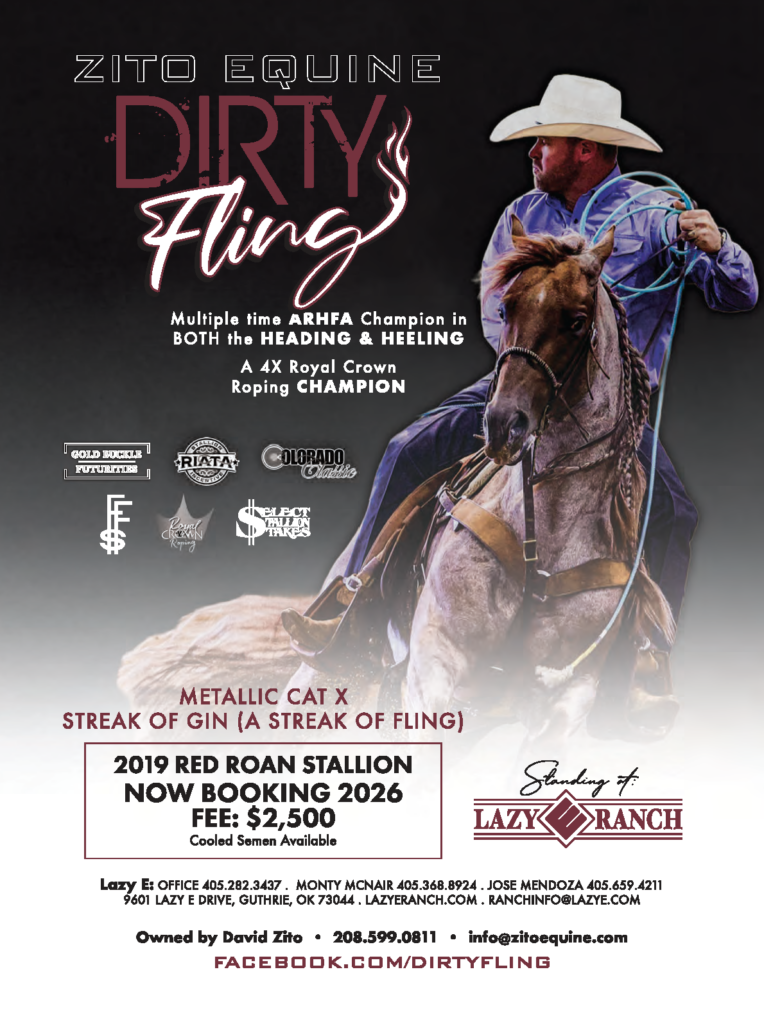 Proven in the arena with the Relentless Remuda’s Trevor Brazile and Miles Baker, Dirty Fling is now under the ownership of Colorado’s Zito Quarter Horses, who’ve committed to crossing him on the industry’s top mares to continue to elevate his presence.