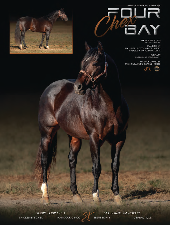 Originating from Haythorn Land & Cattle Co., Four Chex Bay is not just a sight to behold at 15.1 hands and 1,250 pounds, but the 2009 AQHA stallion is a winner who is producing winners. A full brother to Four Bonnie Bay—a winner in numerous AQHA events, including heading, heeling and calf roping—Doobie brings a legacy of excellence to the breeding world.