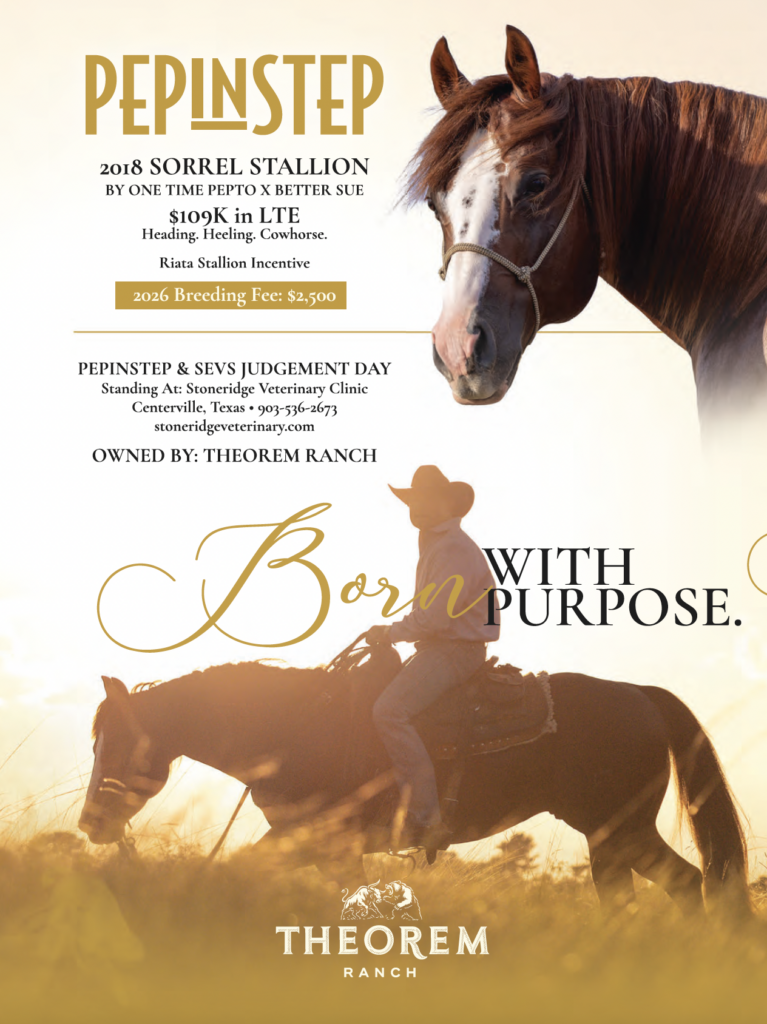 Pepinstep—known around Theorem Ranch as Flash—is a powerful, keen-minded stallion with deep cow horse roots and proven ability in and out of the arena. Bred by the respected Flag Ranch and started by elite cow horse trainer Matt Koch, Pepinstep carries both the physical tools and mental edge to pass on to the next generation of great horses.