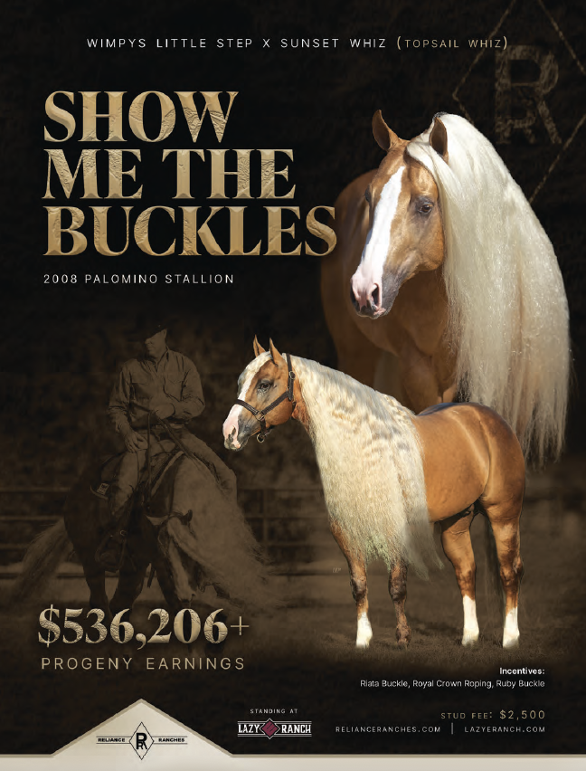As Show Me The Buckles enters his fourth year standing at Lazy E Ranch under Reliance Ranches, his influence on the rope horse industry continues to accelerate. The 2008 palomino stallion, a former NRHA Open Futurity Co-Reserve Champion, has established himself as a leading sire whose get are consistently rising to the top of the futurity and derby ranks.