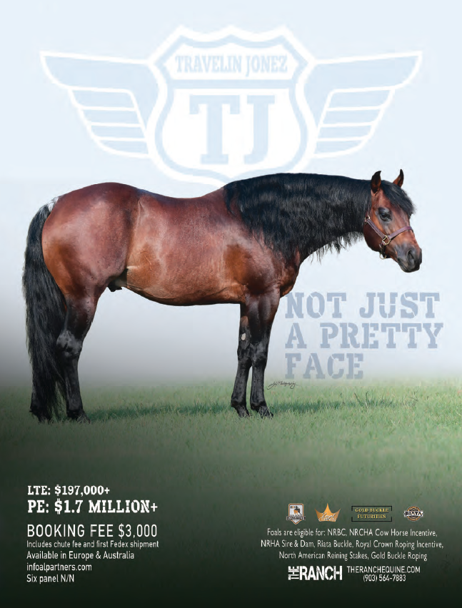 From major cow horse finals to high-pressure team roping setups, Travelin Jonez sires horses that can run, rate and finish, then go on to anchor a broodmare band. He is a stallion built for longevity in the arena and in the stud barn.