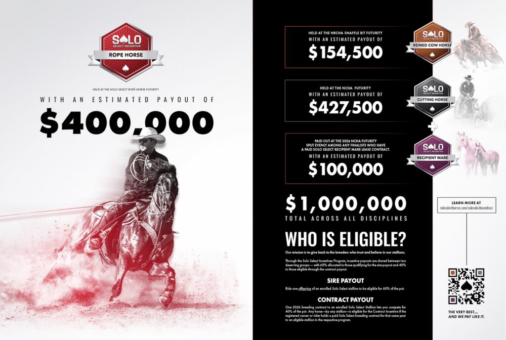 The 2026 Solo Select Incentive is a million-dollar program built to reward horses sired by Solo Select stallions nominated to one or more incentive pots. For ropers, that includes heading, heeling, calf roping and breakaway. The program also funds large incentive pots in cutting and reined cow horse, which increases stallion participation and strengthens the market for all eligible foals.