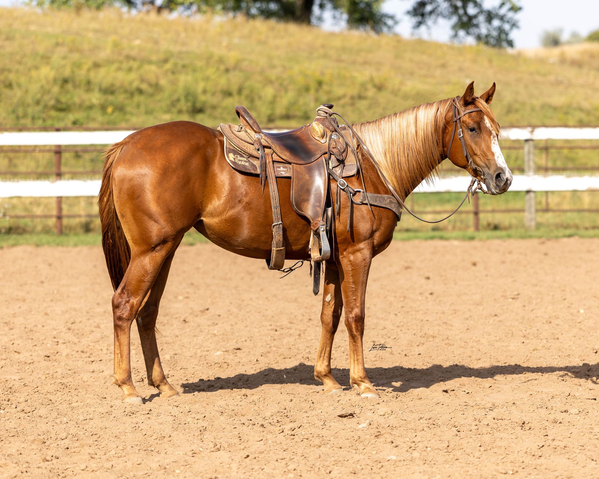 2024 sorrel gelding by Ima Special Kindaguy out of AR Skylines Curator (Mr Skyline Peppy). Known for his snappy extension and low‑knee action, this gelding has both cow and champion race bloodlines. He leads well and is walker‑broke.