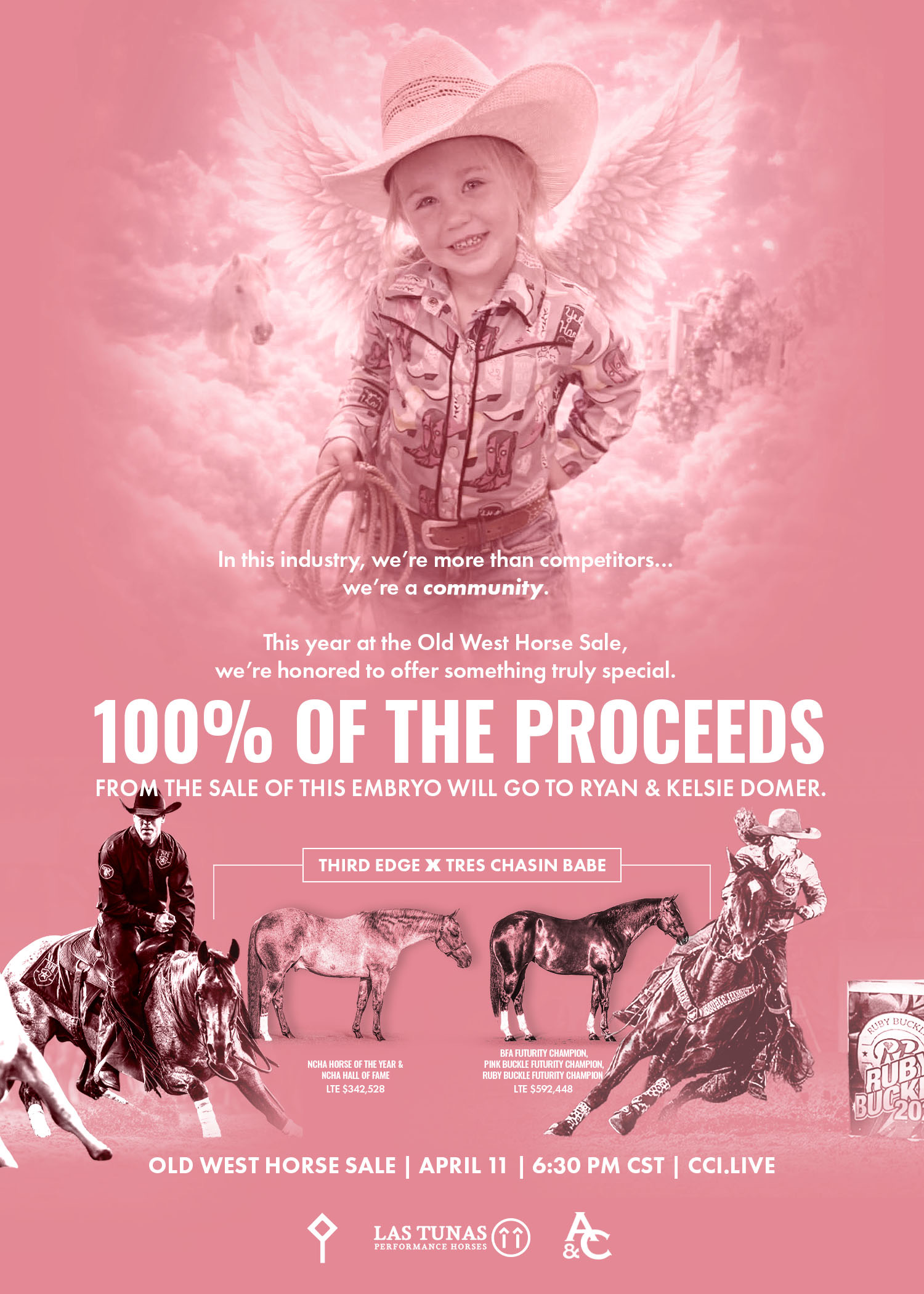 An embryo by Third Edge out of $592,448-earner Tres Chasin Babe PZ will sell April 11 at the Old West Horse Sale, with 100% of the proceeds going to Ryan and Kelsie Domer following the loss of their 3-year-old daughter, Oaklynn.